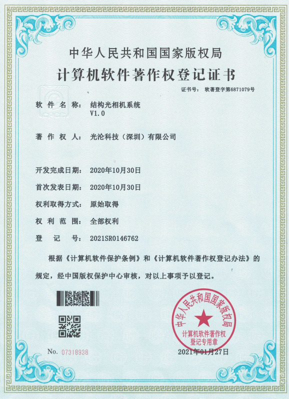 光淪科技工業機器人視覺相機獲得了多項國家專利及軟件著作權,公司自成立以來一直堅持自主知識產權研發工業3D相機!